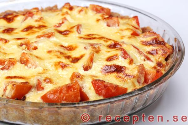Tacopaj - Recept - Tacopaj med tacokryddad köttfärs, tomater och ett gott täcke. 400 gram nötköttfärs 1 litet pkt philadelphiaos 1 brk creme fraiche 1 pse tacokrydda 1 gul lök 1 röd paprika. Ev: Alternativ pajdeg utan förgräddning: 4 dl vetemjöl 2 tsk.